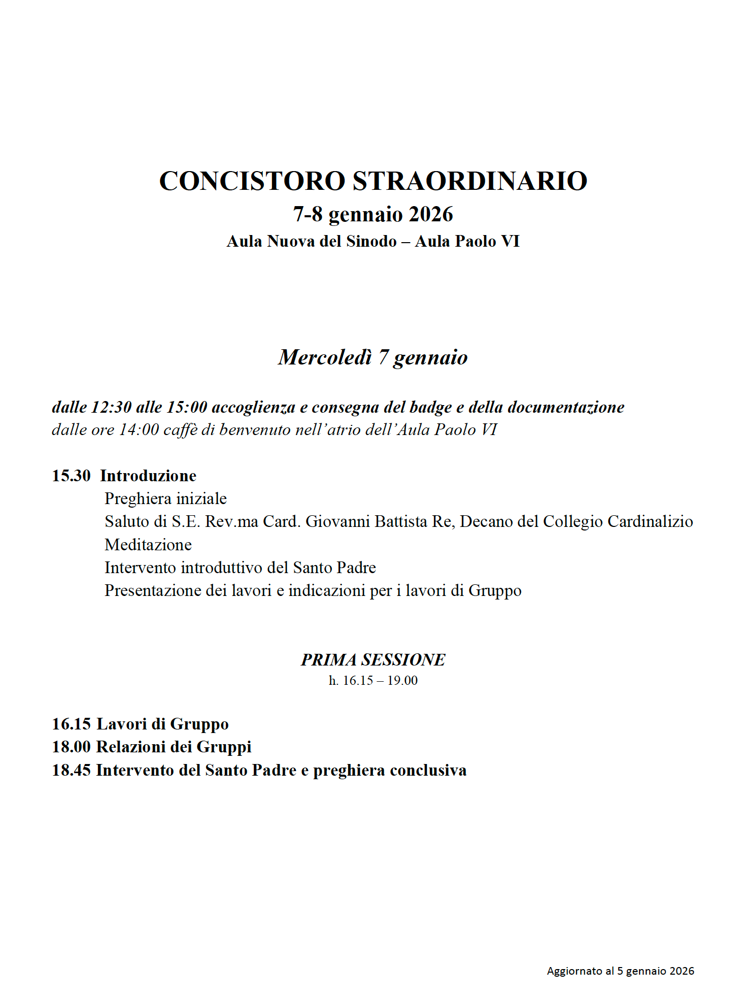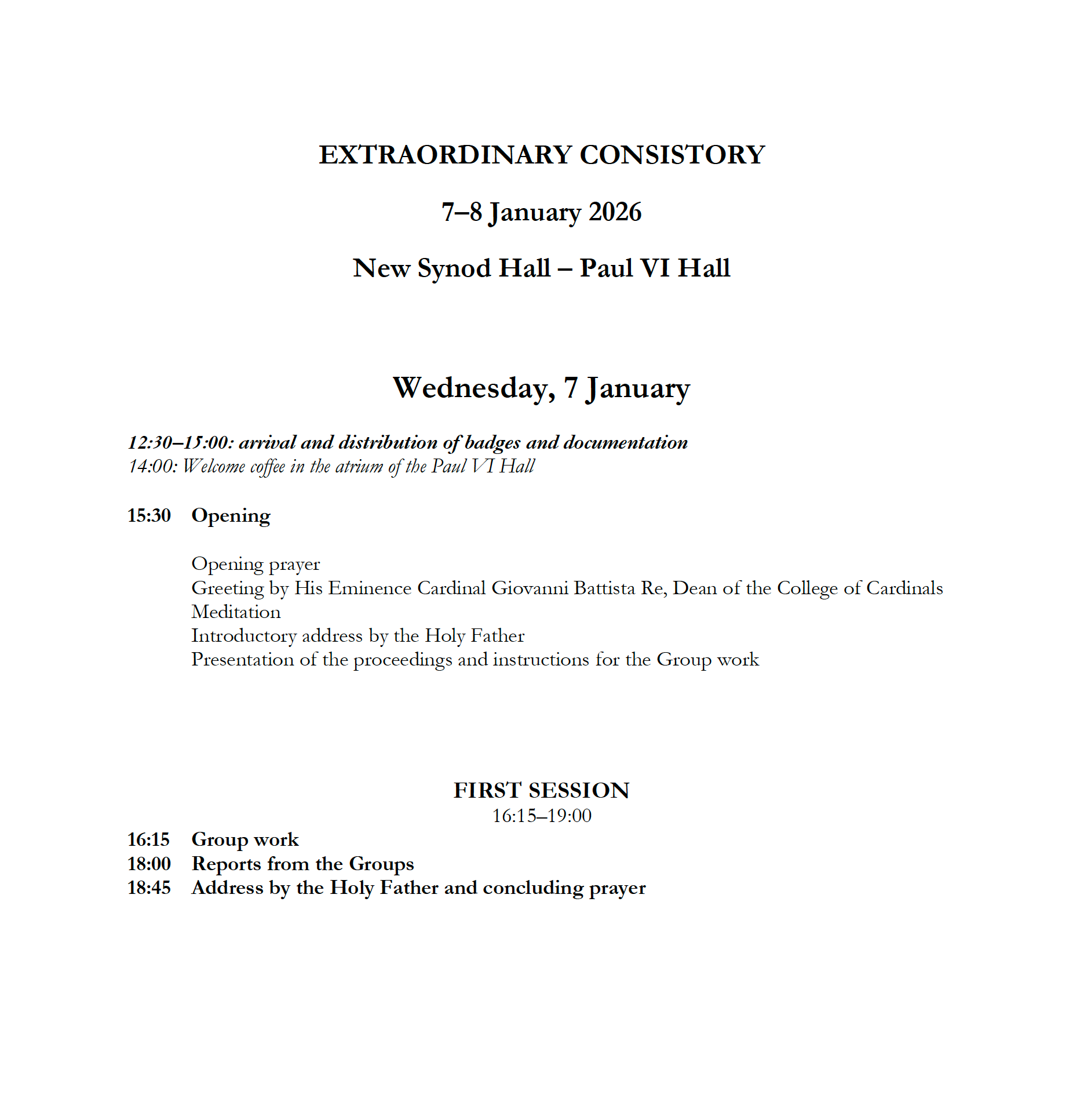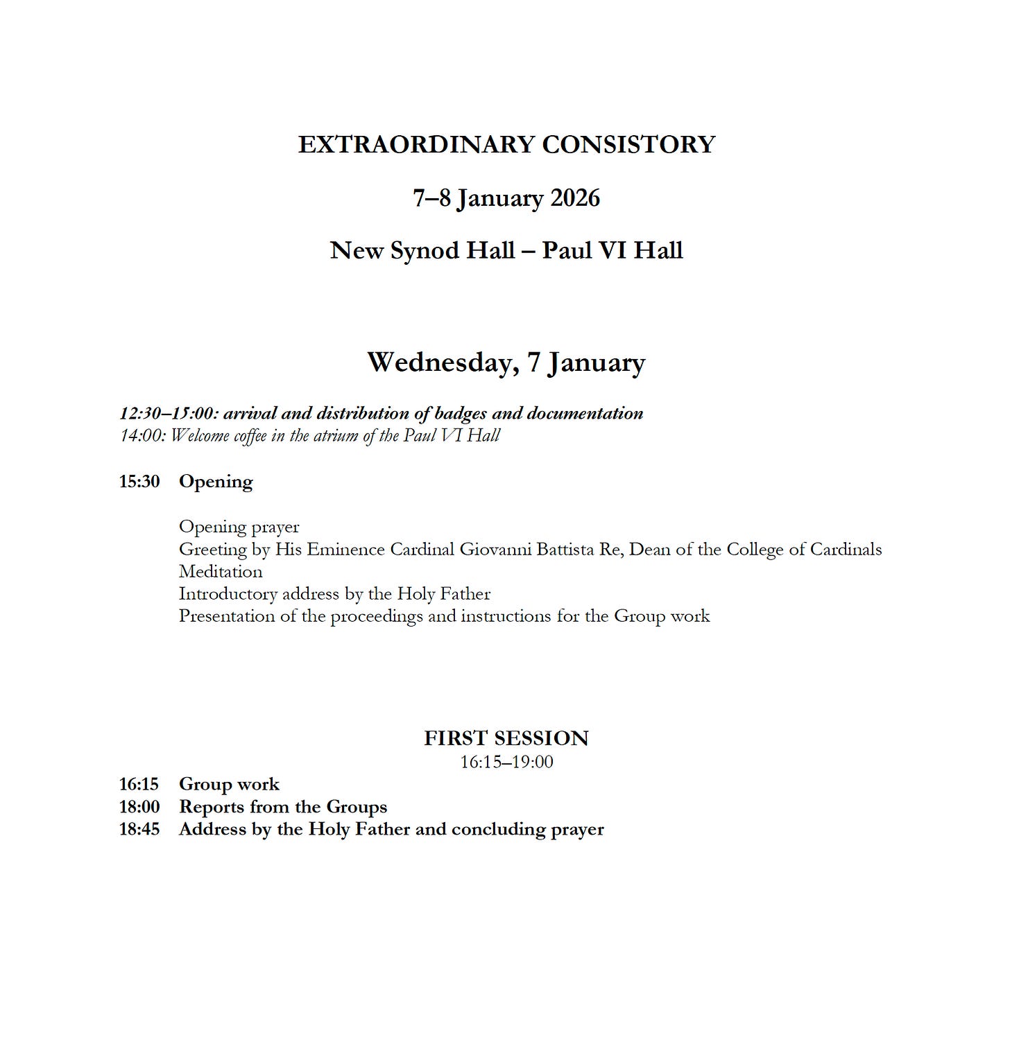 ROME, 6 January 2026 — The College of Cardinals Report has obtained the official program for the Extraordinary Consistory of Cardinals convened at the Vatican by Pope Leo XIV on Jan. 7-8.